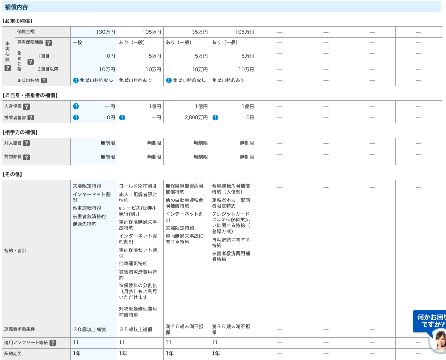 SBI損保が断トツで安かったのですが、補償内容の表を確認して理由がわかりました。